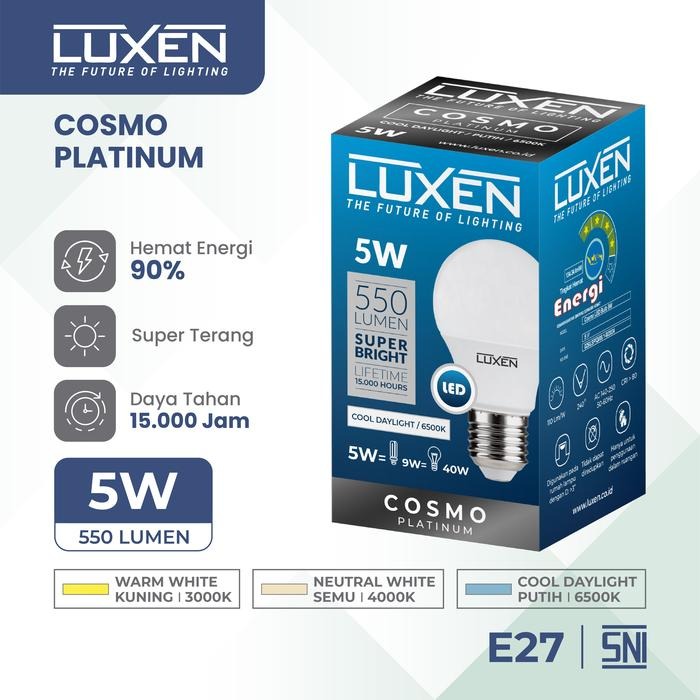 Luxen COSMOLED 5W Warm White (3000K) adalah lampu LED bohlam hemat energi yang dirancang untuk memberikan pencahayaan hangat dan nyaman. Dengan konsumsi daya hanya 5 watt, lampu ini cocok untuk penggunaan di berbagai ruangan seperti kamar tidur, ruang tamu, atau area santai lainnya.