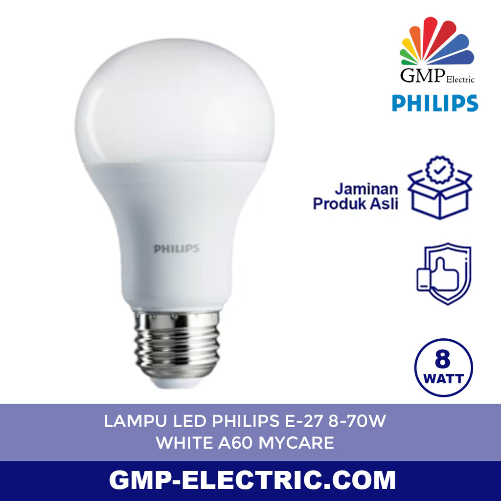 Philips LED MyCare 8W E27 A60 adalah lampu LED berkualitas tinggi yang dirancang untuk memberikan pencahayaan yang efisien dan tahan lama. Berikut adalah spesifikasi utama produk ini:
