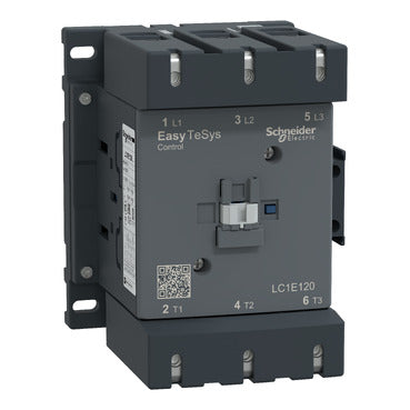 Schneider LC1E120 (varian: LC1E120M5, LC1E120F5) adalah kontaktor elektromagnetik 3 kutub dari seri Easy TeSys Control, dirancang untuk aplikasi motor listrik hingga 59kW (AC / 3 / 440V). Dilengkapi dengan 3 kontak utama NO serta 1 kontak bantu NO + 1 kontak bantu NC, kontaktor ini cocok untuk pengendalian motor industri daya besar, sistem HVAC, dan aplikasi distribusi daya berat. Dengan lebar 120 mm, kontaktor ini memberikan keseimbangan antara performa tinggi dan kemudahan instalasi dalam panel kontrol skala besar.