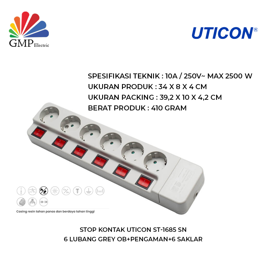 Stop Kontak Uticon ST-1685 SN adalah stop kontak listrik 6 lubang berwarna grey (abu-abu) yang dirancang untuk memberi kendali penuh atas setiap soket. Setiap lubang soket dilengkapi saklar ON/OFF sendiri-sendiri, sehingga kamu bisa menyalakan atau mematikan perangkat satu per satu tanpa memengaruhi yang lain.